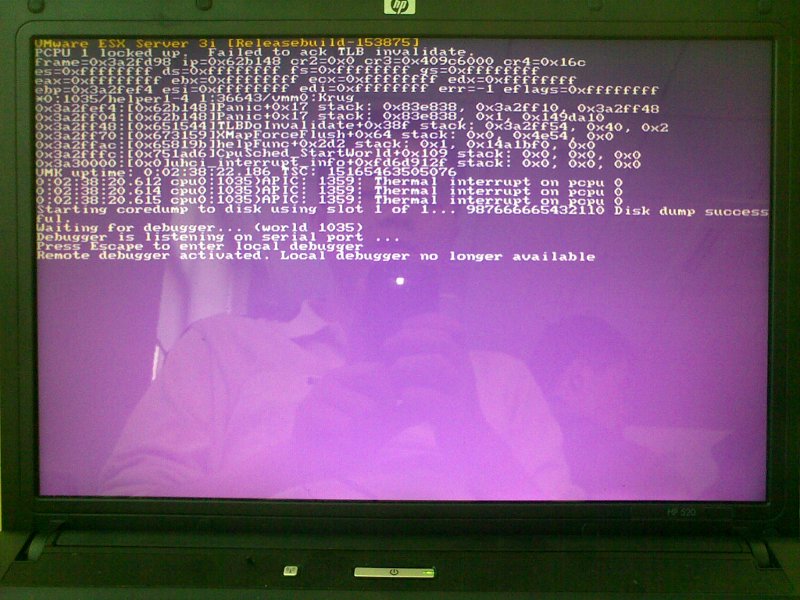 For the sake of testing our product(krugle) easily, I installed VMWare ESXi 3.5.0 build 153875 on a HP laptop(HP 520) before the new server is delivered to our office, but unfortunately it failed to work, for several times it just threw me a screen with purple background, which is much like M$'s famous blue screen ;) it said "PCPU 1 locked up. Failed to ack TLB invalidate...", here is one of the screenshots I took when the errors occurred: